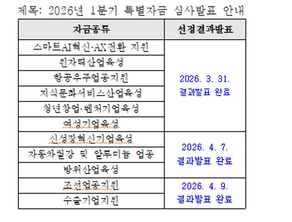 위의 일정에 따라 2026년 1분기 특별자금 심사발표가 완료되었으니 참고바랍니다.